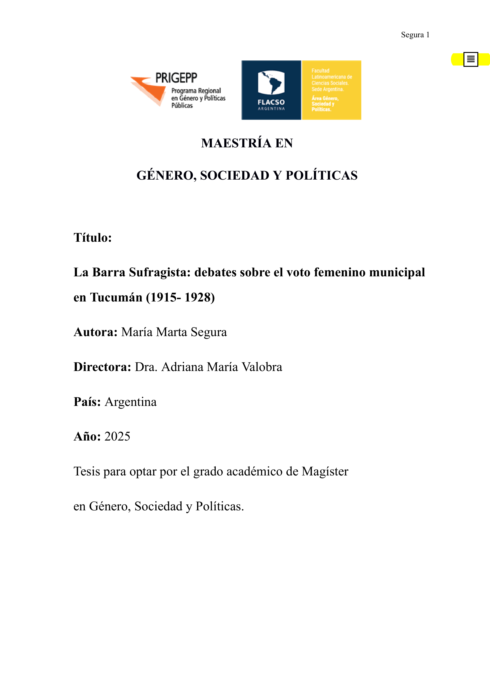 Cita Sugerida : | Segura, María Marta (2025). La Barra Sufragista: debates sobre el voto femenino municipal en Tucumán (1915-1928) . Tesis de Maestría. FLACSO. Sede Académica Argentina, Buenos Aires. |