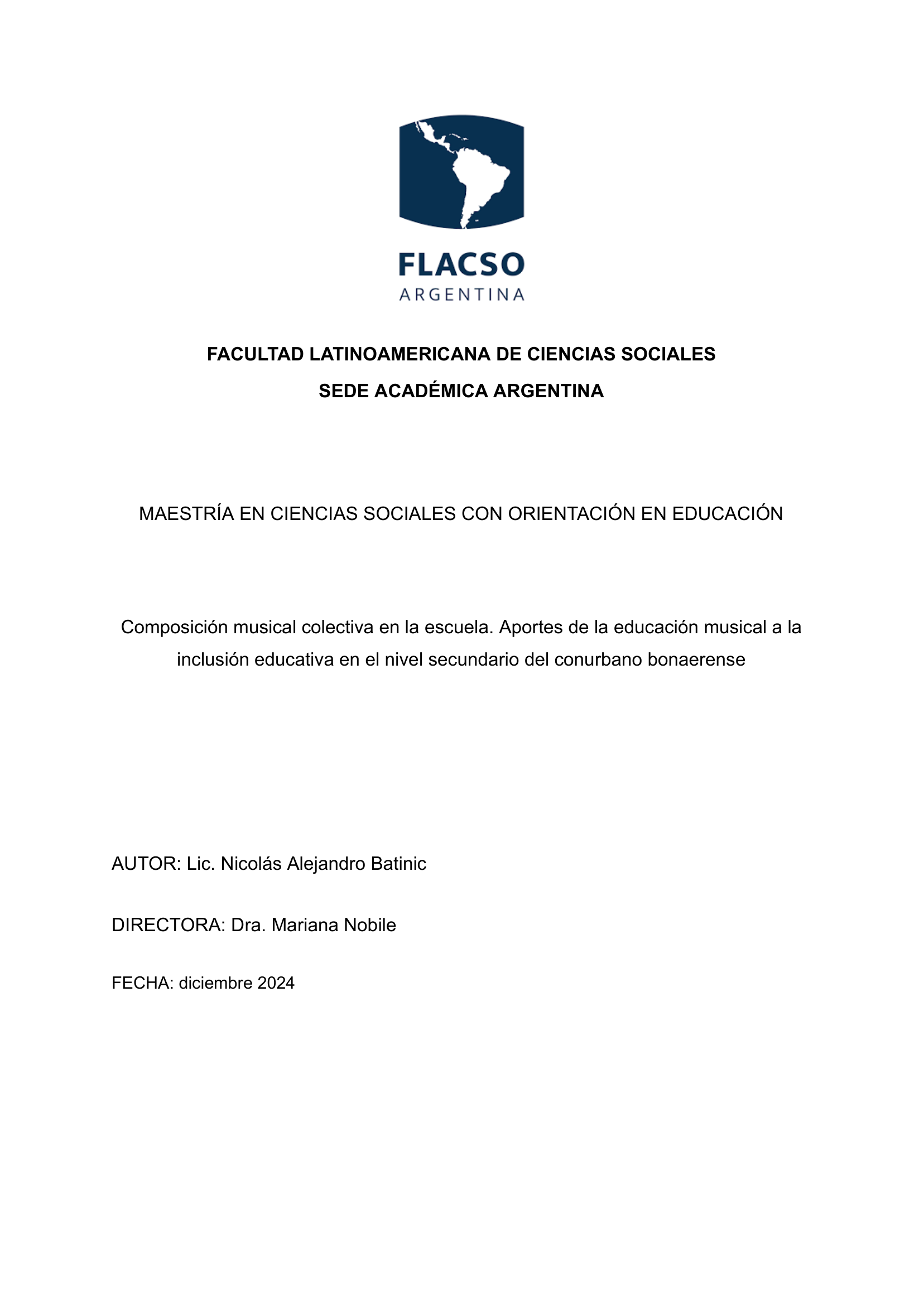 Cita Sugerida : | Batinic, Nicolás Alejandro (2024). Composición musical colectiva en la escuela. Aportes de la educación musical a la inclusión educativa en el nivel secundario del conurbano bonaerense. Tesis de Maestría. FLACSO. Sede Académica Argentina, Buenos Aires. |