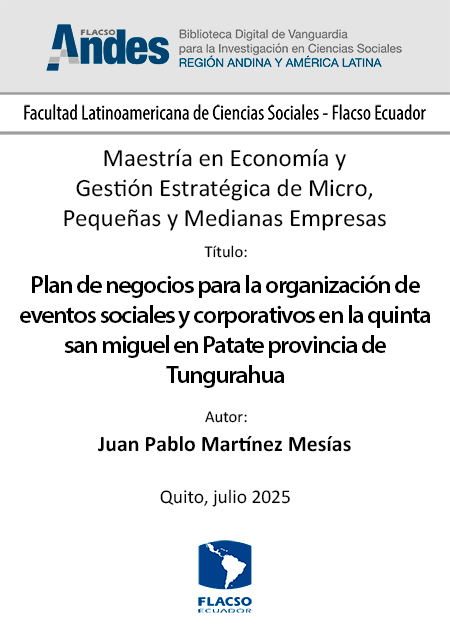 Cita Sugerida : Martínez Mesías, Juan Pablo. 2025. Plan de negocios para la organización de eventos sociales y corporativos en la Quinta San Miguel en Patate provincia de Tungurahua. Tesis de maestría, Flacso Ecuador.