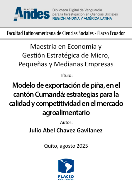 Cita Sugerida : | Chavez Gavilanez, Julio Abel. 2025. Modelo de exportación de piña, en el cantón Cumandá: estrategias para la calidad y competitividad en el mercado agroalimentario. Tesis de maestría, Flacso Ecuador. |