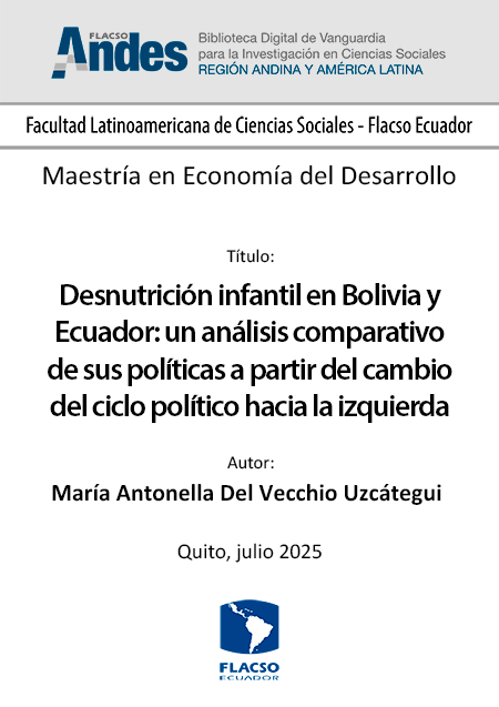 Cita Sugerida : | Del Vecchio Uzcátegui, María Antonella. 2025. Desnutrición infantil en Bolivia y Ecuador: un análisis comparativo de sus políticas a partir del cambio del ciclo político hacia la izquierda. Tesis de maestría, Flacso Ecuador. |