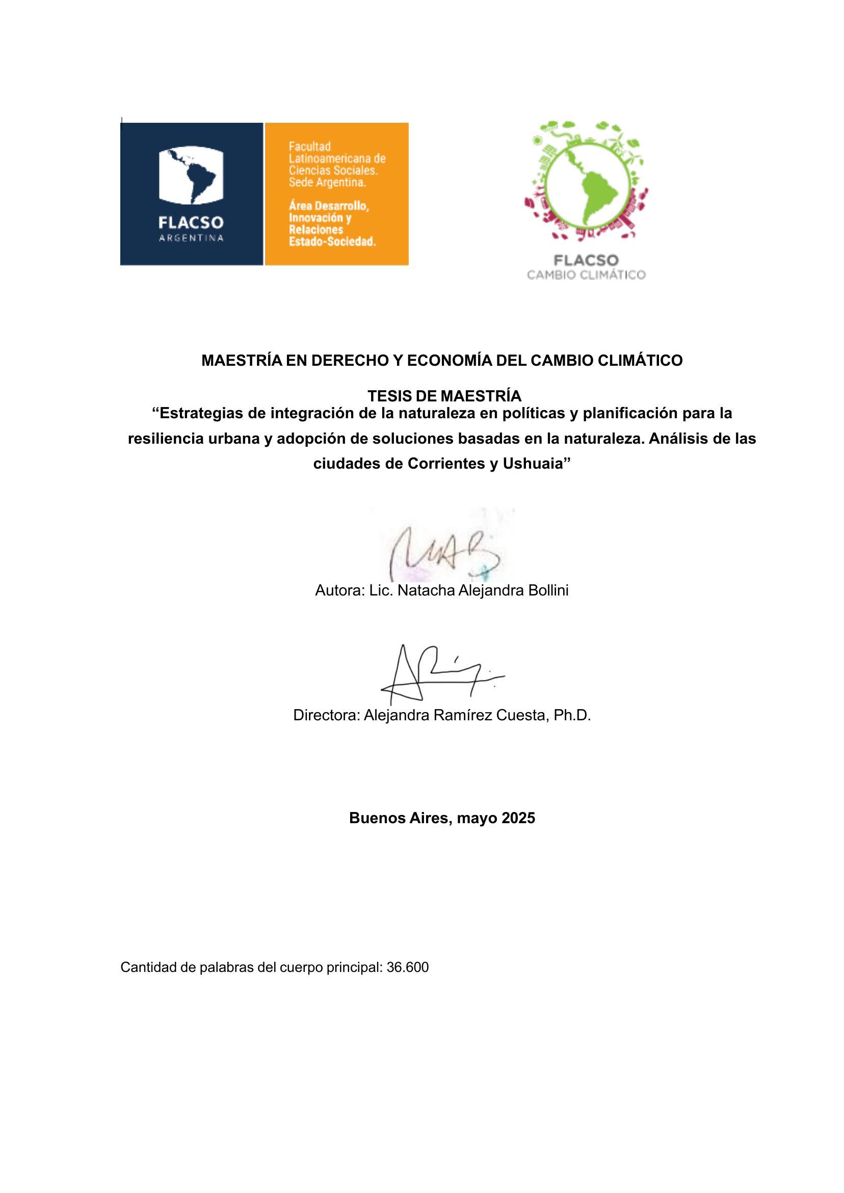 | Citation: | Bollini, Natacha Alejandra (2025). Estrategias de integración de la naturaleza en políticas y planificación para la resiliencia urbana y adopción de soluciones basadas en la naturaleza. Análisis de las ciudades de Corrientes y Ushuaia. Tesis de Maestría. FLACSO. Sede Académica Argentina, Buenos Aires. |
