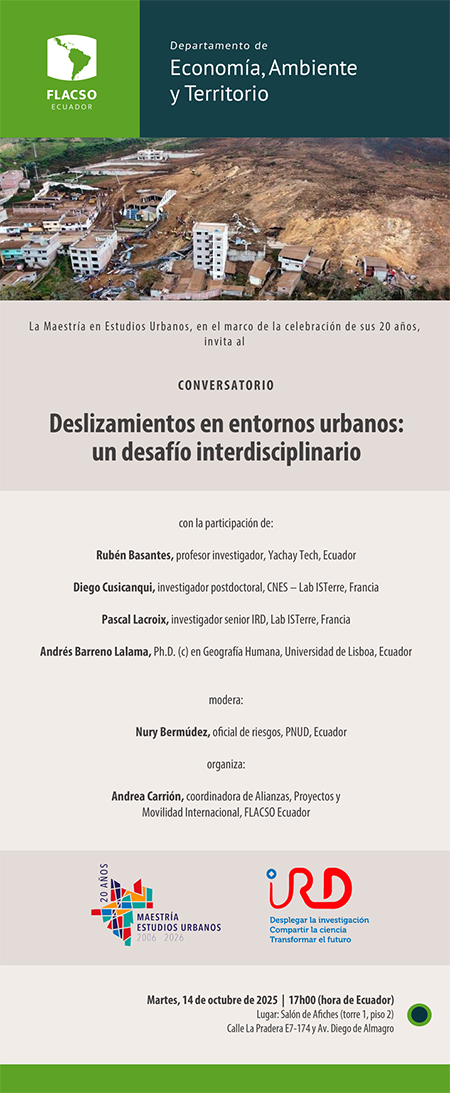 Cita Sugerida : | Carrión Hurtado, Andrea, coord., 2025. Conversatorio "Deslizamiento en entornos urbanos: un desafío interdisciplinario". FLACSO Ecuador, 14 de octubre, archivo en MP4. |