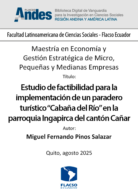 Cita Sugerida : | Miguel Fernando, Pinos Salazar. 2025. Estudio de factibilidad para la implementación de un paradero turístico “Cabaña del Río” en la parroquia ingapirca del cantón Cañar. Tesis de maestría, Flacso Ecuador. |