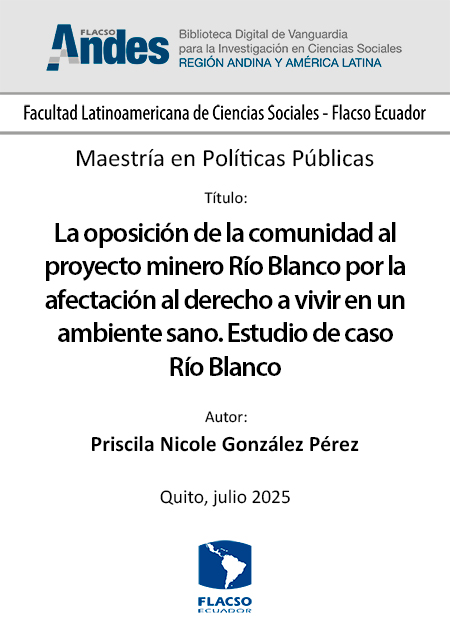 Cita Sugerida : | González Pérez, Priscila Nicole. 2025. La oposición de la comunidad al proyecto minero Río Blanco por la afectación al derecho a vivir en un ambiente sano. Estudio de caso Río Blanco. Tesis de maestría, Flacso Ecuador. |