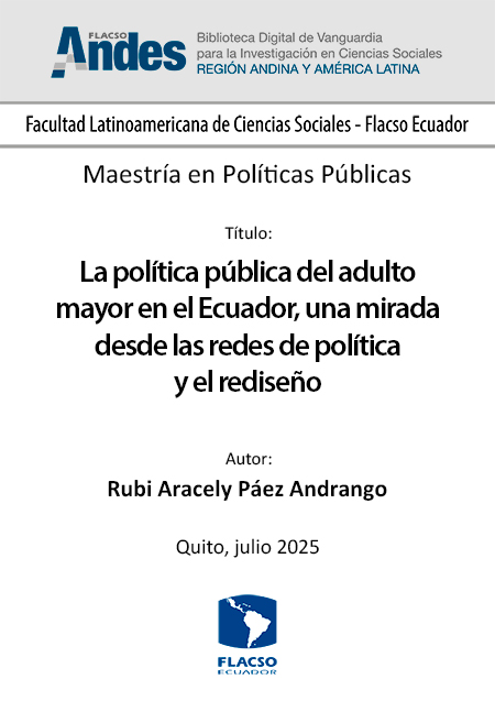 Cita Sugerida : | Páez Andrango, Rubi Aracely. 2025. La política pública del adulto mayor en el Ecuador, una mirada desde las redes de política y el rediseño. Tesis de maestría, Flacso Ecuador. |