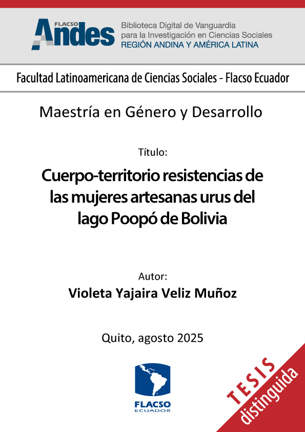 Cita Sugerida : | Veliz Muñoz, Violeta Yajaira. 2025. Cuerpo-territorio resistencias de las mujeres artesanas urus del lago Poopó de Bolivia. Tesis de maestría, Flacso Ecuador. |