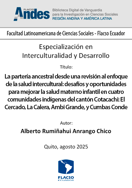 | Citation: | Anrango Chico, Alberto Rumiñahui. 2025. La partería ancestral desde una revisión al enfoque de la salud intercultural: desafíos y oportunidades para mejorar la salud materno infantil en cuatro comunidades indígenas del cantón Cotacachi: El Cercado, La Calera, Ambi Grande, y Cumbas Conde. Tesina de especialización, Flacso Ecuador. |