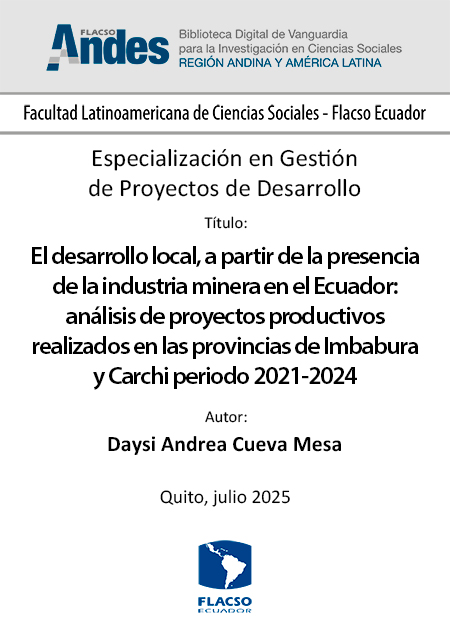 | Cita Sugerida : | Cueva Mesa, Daysi Andrea. 2025. El desarrollo local, a partir de la presencia de la industria minera en el Ecuador: análisis de proyectos productivos realizados en las provincias de Imbabura y Carchi periodo 2021-2024. Tesina de especialización, Flacso Ecuador. |