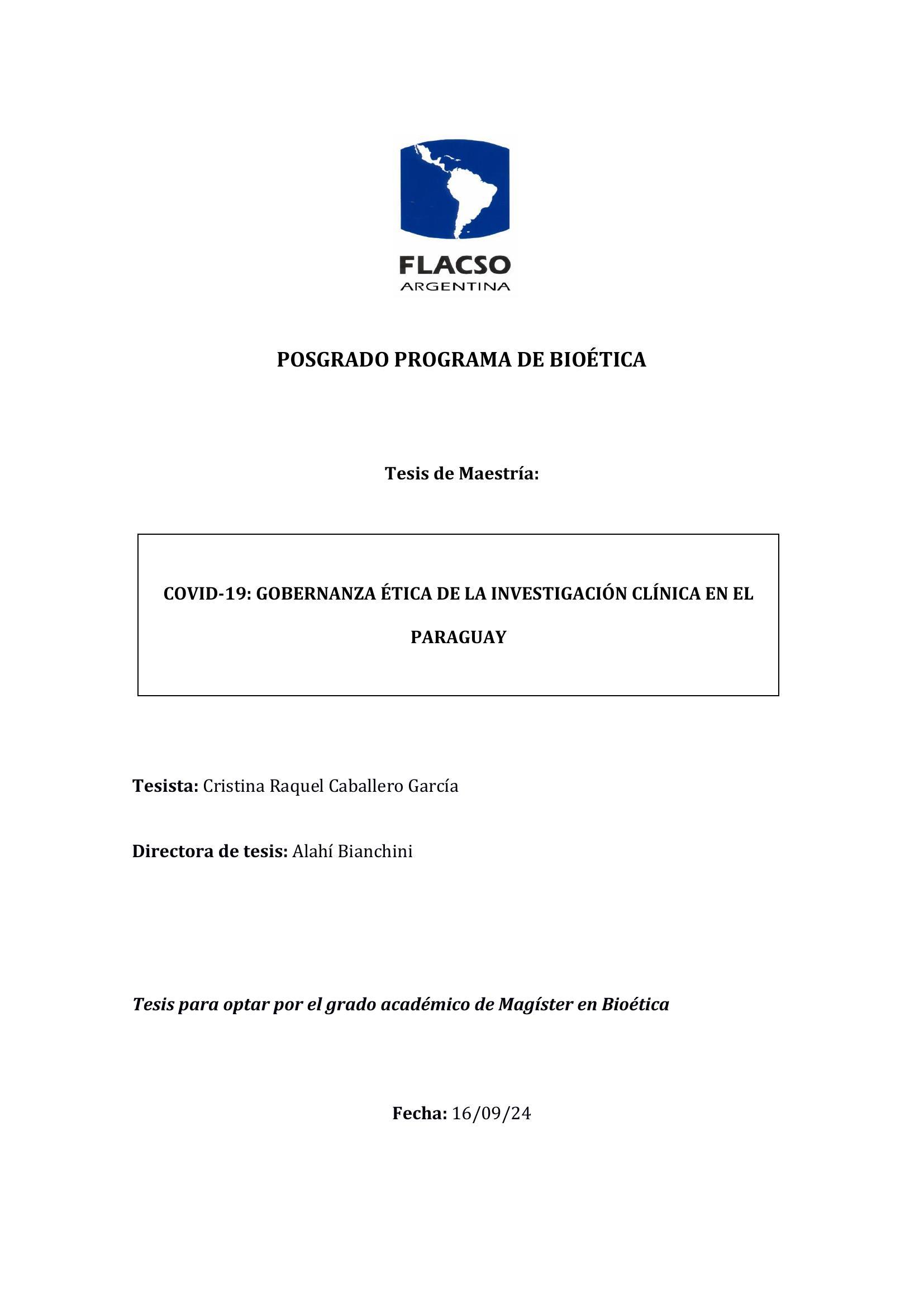| Cita Sugerida : | Caballero García, Cristina Raquel (2024). Covid-19: gobernanza ética de la Investigación Clínica en el Paraguay. Tesis de Maestría. FLACSO. Sede Académica Argentina, Buenos Aires. |