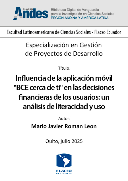 | Cita Sugerida : | Roman Leon, Mario Javier. 2025. Influencia de la aplicación móvil "BCE cerca de ti" en las decisiones financieras de los usuarios: un análisis de literacidad y uso. Tesina de especialización, Flacso Ecuador. |
