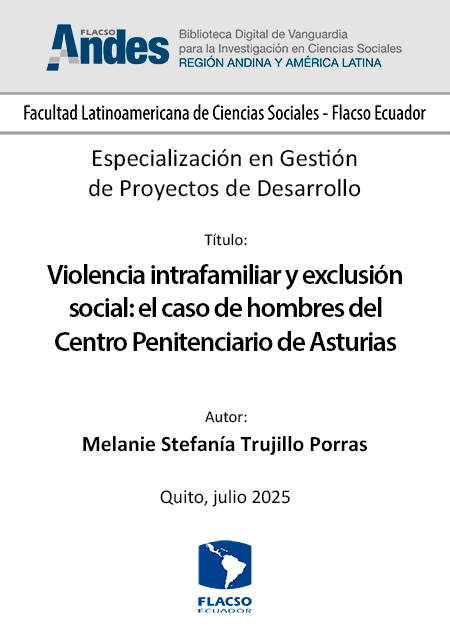 | Cita Sugerida : | Trujillo Porras, Melanie Stefanía. 2025. Violencia intrafamiliar y exclusión social: el caso de hombres del Centro Penitenciario de Asturias. Tesina de especialización, Flacso Ecuador. |