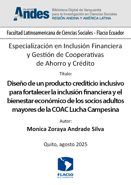 | Cita Sugerida : | Andrade Silva, Monica Zoraya. 2025. Diseño de un producto crediticio inclusivo para fortalecer la inclusión financiera y el bienestar económico de los socios adultos mayores de la COAC Lucha Campesina. Tesina de especialización, Flacso Ecuador. |