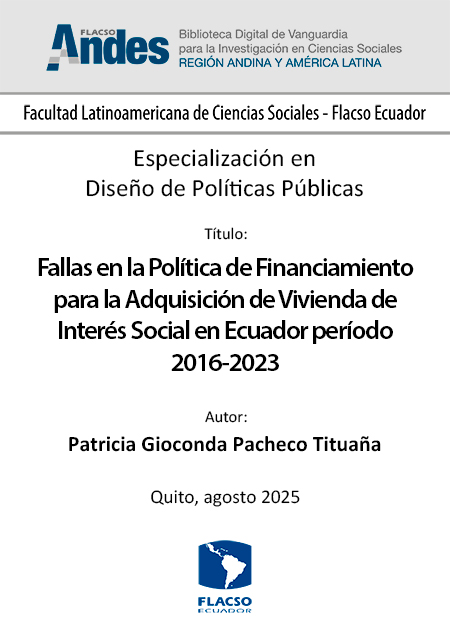 | Citation: | Pacheco Tituaña, Patricia Gioconda. 2025. Fallas en la Política de Financiamiento para la Adquisición de Vivienda de Interés Social en Ecuador período 2016-2023. Tesina de especialización, Flacso Ecuador. |