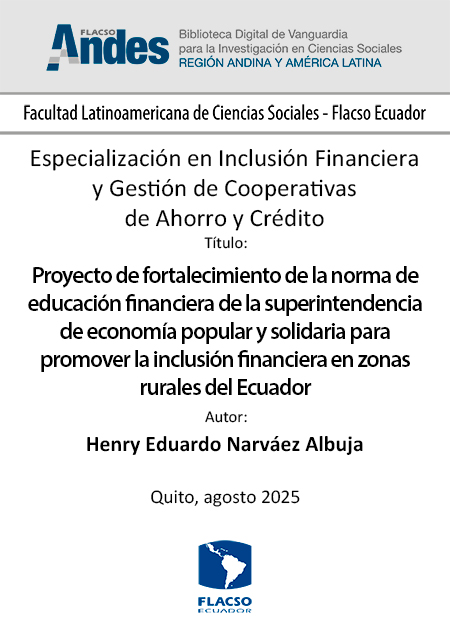 | Citation: | Narváez Albuja, Henry Eduardo. 2025. Proyecto de fortalecimiento de la norma de educación financiera de la superintendencia de economía popular y solidaria para promover la inclusión financiera en zonas rurales del Ecuador. Tesina de especialización, Flacso Ecuador. |