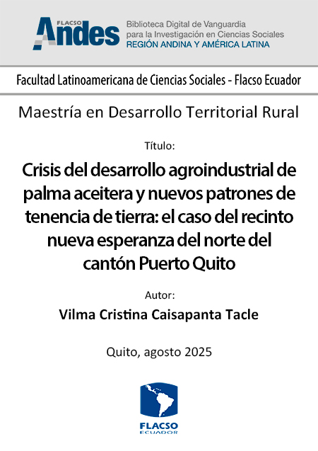 | Cita Sugerida : | Caisapanta Tacle, Vilma Cristina. 2025. Crisis del desarrollo agroindustrial de palma aceitera y nuevos patrones de tenencia de tierra: el caso del recinto nueva esperanza del norte del cantón Puerto Quito. Tesis de maestría, Flacso Ecuador. |