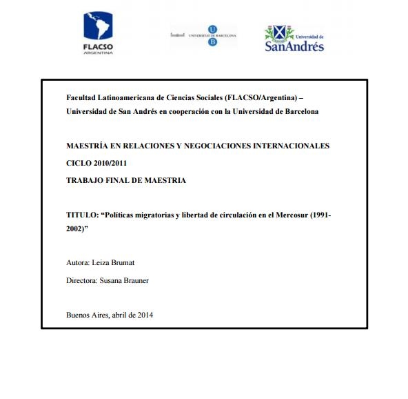 La circulación de las personas es un elemento constitutivo de las regiones y los procesos de integración regional. Las políticas que la regulan son un producto de un complejo juego de articulación de intereses, ideas y factores que se da tanto a nivel nacional como regional e internacional. Se ha escogido al Mercosur por tratarse de una de las experiencias de integración más relevantes y que ha registrado importantes avances y retrocesos en materia de circulación de personas. El caso de estudio está constituido por estas políticas del y en el bloque Mercosur desde su inicio (1991) hasta 2002. Las unidades de análisis son las normas internacionales que regulan la movilidad a nivel global y las políticas regionales acordadas en el área.