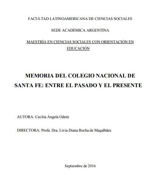La presente tesis de maestría, enmarcada en los estudios de memoria y educación, analiza la memoria del Colegio Nacional de Santa Fe desde diferentes voces que se ponen en juego en la reconstrucción del sentido de la escuela, a partir de las continuidades y cambios en el presente escolar. Desde esta perspectiva, los actores de la escuela participan en la construcción de la memoria colectiva de la institución, conformada por las experiencias vividas y aquellas heredadas que condicionan los procesos de elaboración, rememoración, resignificación y transmisión de la memoria. Los mismos -en tanto miembros de un grupo- intentan mantener en el tiempo una escuela que se ha modificado. Se aborda al Colegio Nacional de Santa Fe en las múltiples y complejas relaciones de su pasado y presente, que operan en la producción de la memoria de la escuela. Se analizan registros orales y, también, escritos desde los cuales emergen núcleos significativos que dan cuenta de las tensiones y continuidades de la memoria escolar. A través de estos, los actores adoptan, por un lado, posiciones que tienden a perpetuar el pasado entendido como “glorioso” y “nacional”; y por otro, generan alternativas que permiten pensar a la escuela y a ellos mismos desde otras perspectivas. This master's thesis is framed in memory studies and education. It analyzes the memory of the National College of Santa Fe, by different voices that participate in the reconstruction of the school sense, based on the continuities and changes at school present. From this perspective, the school actors involved in the construction of the institution's collective memory, formed by their lived and inherited experiences, condition the elaboration processes, remembrance, redefinition and transmission of memory. The same -as members of a group- try to maintain over time a school that has been modified. It set about the National College of Santa Fe in the multiple and complex relationships of its past and present, operating in the production of school memory. Oral and written records are analyzed. From them emerge significant nuclei that realize tensions and continuities of school memory. Through these, the actors adopt, on the one hand, positions that tend to perpetuate the past as "glorious" and "national"; and secondly, generate alternatives which allow thinking about school and themselves, from other perspectives.