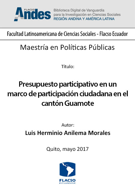 Esta investigación pretende analizar la acción de un gobierno local de Guamote y prácticas en asuntos públicos, función de la voluntad política de los diferentes alcaldes que pasaron en diferentes administraciones después de 2006, en estas circunstancias busca entender la aplicación del presupuesto participativo, partiendo desde sus diversas acepciones y la más cercana al caso de estudio todo esto en función a las dinámicas de participación ciudadana propias que se dieron en su momento y las nuevas disposiciones constitucionales y legales tras ello, visibilizar la democratización de la gestión pública.