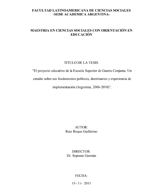 Este trabajo estudia una cuestión clave de la educación de los Oficiales Jefes y Superiores de las Fuerzas Armadas, la “educación conjunta”, y su importancia para la política de Defensa Nacional en la Argentina en el siglo XXI. En particular enfoca la experiencia de la Escuela Superior de Guerra Conjunta y su contribución al fortalecimiento del instrumento militar. En el diseño, desarrollo y resultados de esta tesis hemos dialogado con enfoques teóricos e investigaciones sobre el gobierno político de la defensa, relaciones civiles-militares y educación militar en las Fuerzas Armadas Argentinas. De esta manera, la investigación analiza los fundamentos políticos y doctrinarios que definieron la creación de la Escuela Superior de Guerra Conjunta por la conducción política de la Defensa; las orientaciones doctrinarias, institucionales y curriculares objetivadas en su proyecto; y las interpretaciones sobre esas experiencias producidas por funcionarios del Ministerio de defensa, la conducción de las Fuerzas Armadas en el área de educación, directivos, profesores y alumnos de esa escuela. This work studies a key point of education chiefs and superiors officers of the Armed Forces, the "joint education", and its importance for national defense policy in Argentina policy in the 21st century. In particular it focuses on the experience of the “Escuela Superior de Guerra Conjunta” and its contribution to the strengthening of the military instrument. In the design, development and results of this thesis we spoke with theoretical with approaches and research on the political government of the defense, civilian-military relations and military education in the Argentine Armed Forces. In this way, the research analyzes the political and canonical bases that defined the creation of the “Escuela Superior de Guerra Conjunta” by the political leadership of the defence; the doctrinaire, institutional orientations and curriculum in its project; and the interpretations on these experiences by officials of the Ministry of Defense, the leaderships of Armed Forces in the area of education, directors, teachers and students of this school.