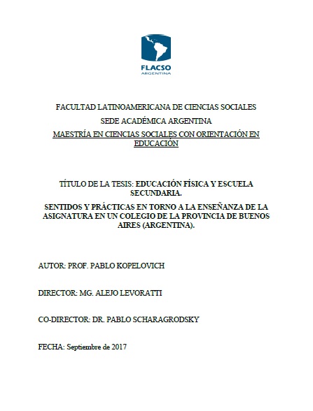 La tesis indaga en los sentidos y prácticas que circulan en el nivel secundario de una institución de nivel medio en torno a la asignatura Educación Física (en adelante EF). Discutimos el lugar que ocupa la asignatura en la propuesta formativa de la institución, considerando que los directivos estiman que reciben alumnos de población media a media-alta. Nos proponemos estudiar las diferentes concepciones disciplinares sobre la EF que se presentan en los documentos institucionales, y que tienen profesores de la asignatura y el modo en que plasman ello en las clases; e identificar, analizar y comparar los sentidos y las prácticas sobre la EF y el deporte, circulantes en las clases de EF, y su consecuente forma de considerar los cuerpos de los alumnos1. De este modo, abordamos el vínculo entre los distintos niveles de decisión curricular, especialmente entre el nivel institucional y el de la situación de enseñanza. Analizamos, en definitiva, cómo se inscribe la EF en el proceso de socialización de los alumnos, desde el abordaje de la vida cotidiana escolar.