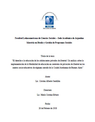 La presente investigación de carácter exploratorio y descriptivo busca analizar la implementación de la Modalidad de educación en contextos de privación de libertad en los centros socio-educativos cerrados que alojan adolescentes por temas penales y que dependen en la actualidad del Consejo de los Derechos de Niños, Niñas y Adolescentes del Gobierno de la Ciudad Autónoma de Buenos Aires, a partir de la opinión de los principales actores involucrados. Para ello, el análisis se posiciona desde el Paradigma de la Protección Integral de los Derechos de Niños, Niñas y Adolescentes y en este sentido adopta la perspectiva teórica-conceptual de los derechos humanos. Su propósito es aportar a la discusión, al conocimiento y a la revisión de prácticas institucionales sobre el derecho a la educación de los adolescentes que se encuentran privados de su libertad en instituciones de encierro por cuestiones penal.