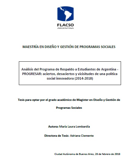 Esta tesis plantea un análisis integral del Programa de Respaldo a los Estudiantes Argentinos (PROGRESAR), política social de carácter nacional implementada en el año 2014. Para ello, recurre a distintos tipos de fuentes, tanto cuantitativas como cualitativas. El PROGRESAR marcó la continuidad de las políticas de ampliación del sistema de protección social desarrolladas entre 2003 y 2015, basadas fundamentalmente en transferencias monetarias directas y sostenida en una concepción simbiótica de la política social y el crecimiento económico. Partiendo de un diagnóstico novedoso sobre la situación juvenil y con objetivos de carácter integral, en su concepción inicial priorizó la finalización de la educación obligatoria, aunque por el abandono de algunos de los componentes más ambiciosos previstos en el diseño original (redes de tutores y de cuidado infantil) y por distintas barreras de acceso, en los hechos la población atendida perteneció mayoritariamente a jóvenes de sectores medios-bajos ya insertos en la educación superior.