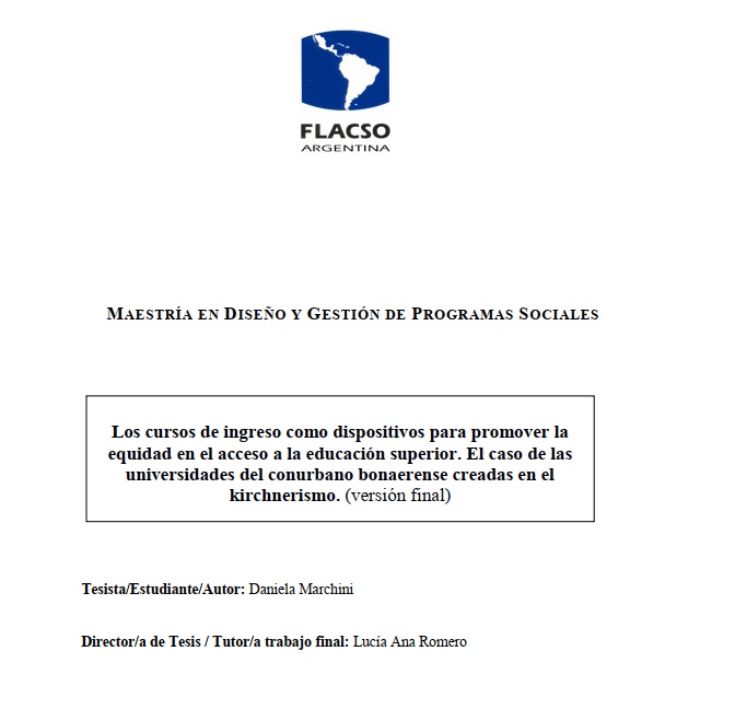 Esta tesis aborda la cuestión de la equidad en el acceso al sistema universitario argentino durante el kirchnerismo. En particular se analizan los cursos de ingreso como dispositivos institucionales para evitar la deserción de estudiantes durante el primer año de sus trayectorias académicas. Los casos seleccionados son las Universidades Nacionales de José Clemente Paz, Moreno y Arturo Jauretche. Se parte de un enfoque organizacional por considerar que son las instituciones y las políticas públicas las que contribuyen al fenómeno de la equidad. En línea con este enfoque la metodología utilizada es cualitativa e incluye entrevistas a autoridades y gestores de los cursos de ingreso, junto con al análisis de fuentes de datos secundarios. Luego del análisis realizado se concluye que las universidades creadas por el kirchnerismo en el Conurbano Bonaerense contienen la capacidad de elevar el piso de equidad educativa. Asimismo se advierte que las características institucionales de los cursos de ingreso, particularmente las estrategias pedagógicas dentro del aula, inciden en la efectividad de los mismos; y que los desafíos pendientes de resolver deben ser abordados con una planificación de mediano plazo y para ello resulta clave poder comunicar los resultados, como modo de legitimar la búsqueda de recursos que permita sostener las políticas de ingreso y permanencia en poblaciones históricamente excluidas del acceso a la universidad.