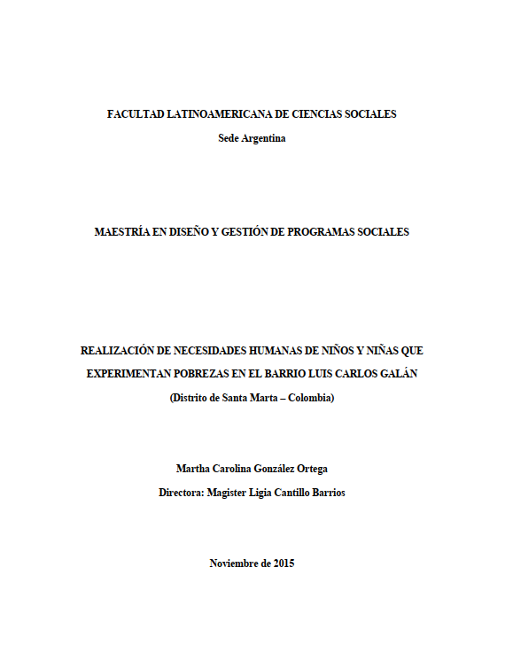 Esta investigación de maestría aborda la relación entre necesidades humanas, segunda infancia y género. Se trata de una indagación de corte cualitativo, que examina la realización de las necesidades humanas en la segunda infancia, en un contexto de múltiples carencias, analizando específicamente las asimetrías que se presentan en esta realización según se trate de niñas o niños. En el proceso investigativo se identificaron los satisfactores de las necesidades humanas en la segunda infancia y se realizó la comparación de estos entre niñas y niños. De igual modo, se tuvo acceso a las percepciones de miembros claves de la dinámica familiar (padres y madres de familia) en torno a la realización de las necesidades humanas de sus hijos e hijas. Luego del proceso de análisis pudo evidenciarse que muchos de los satisfactores de las necesidades de los niños y las niñas, limitan en gran medida su realización. Pudo concluirse que en las familias analizadas los recursos y el poder se distribuyen de manera desigual entre sus miembros, específicamente entre los niños y las niñas. Así, el hogar se constituye en un lugar en el que no se están fomentando relaciones justas e igualitarias entre niños y niñas.
