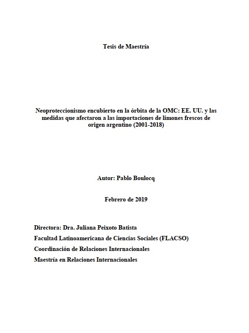 Mundial de Comercio (OMC). Este accionar ocurre dentro de la órbita institucional de un organismo internacional cuya función principal es dirimir ante conflictos y diferencias entre países en materia de intercambio de productos y de servicios. Las decisiones de la OMC tienden a promover el comercio a partir de discusiones de índole política, jurídica, comercial y técnica entre los Estados Miembros. El caso analizado en este trabajo ―Los Estados Unidos de América (EE. UU) que cerró sus mercados para la exportación de limones desde la región del noroeste argentino (NOA) entre 2001-2018 por ―cuestiones sanitarias‖― se presenta como un claro ejemplo de la tendencia global a utilizar cuestiones técnicas en el comercio internacional para cerrar mercados nacionales y así proteger las producciones locales. Este conflicto involucra a actores públicos y privados, nacionales e internacionales dentro de un sistema de comercio internacional defectuoso, asimétrico o, por lo menos, contradictorio. Es por ello que consideramos que es relevante desglosar las distintas etapas —Preocupaciones Comerciales Específicas (PCE) y Órgano de Solución de Diferencias (OSD)— de este conflicto en el marco de la OMC para describir y analizar la toma de decisiones ante el planteo de un conflicto comercial entre dos o más países. Se trata de un estudio de caso sobre el conflicto de los limones que involucra a Argentina y a EE. UU. en el marco de la OMC, para lo que se describirá y analizará la aplicación de barreras no arancelarias por parte de EE. UU en ese episodio. Este análisis servirá para entender, sobre la base de los conceptos de Paz Americana y de hegemonía global de la corriente de Economía Política Internacional (EPI), tanto el comportamiento de algunos Estados Miembros y de los fundadores de instituciones intergubernamentales competentes en esta problemática, como los procesos y etapas en materia de derecho internacional que atraviesan instituciones como la OMC.