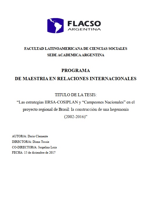 Esta investigación se inscribe en el área de estudio de las Relaciones Internacionales, más específicamente, en el campo de Economía Política Critica. Su objetivo principal es reconstruir el rol de la Iniciativa de Infraestructura para la Región SudAmericana (IIRSA) y de la política de creación e internacionalización de empresas Campeones Nacionales (CN) en el proyecto regional de Brasil y en la construcción de una hegemonía brasileña en Sudamérica. A partir de esto buscamos sentar las bases de un análisis ampliado de la construcción de poder de Brasil en Sudamérica, desde un enfoque neogramsciano de las Relaciones Internacionales.El periodo considerado es 2002-2016, intervalo de tiempo que nos permite observar el nacimiento, auge y posterior debilitamiento de IIRSA y CN, consideradas como las políticas más representativas de la actuación regional reciente de Brasil. 3ResumenEsta investigación se inscribe en el área de estudio de las Relaciones Internacionales, más específicamente, en el campo de Economía Política Critica. Su objetivo principal es reconstruir el rol de la Iniciativa de Infraestructura para la Región SudAmericana (IIRSA) y de la política de creación e internacionalización de empresas Campeones Nacionales (CN) en el proyecto regional de Brasil y en la construcción de una hegemonía brasileña en Sudamérica. A partir de esto buscamos sentar las bases de un análisis ampliado de la construcción de poder de Brasil en Sudamérica, desde un enfoque neogramsciano de las Relaciones Internacionales.El periodo considerado es 2002-2016, intervalo de tiempo que nos permite observar el nacimiento, auge y posterior debilitamiento de IIRSA y CN, consideradas como las políticas más representativas de la actuación regional reciente de Brasil.A partir del objetivo mencionado, analizamos IIRSA y CN como estrategias del Estado brasileño, componentes diferenciados pero complementarios de su proyecto regional. En particular, reconstruimos su despliegue y lo relacionamos con los efectos que esto tiene sobre los países sudamericanos, así como las respuestas que provoca en los gobiernos de la región y en sectores de la sociedadcivil. Coherentemente con nuestro abordaje neogramsciano, nos interrogamos sobre el alcance de estas estrategias en la producción deconsenso en la región alrededor de ellas mismas y del proyecto regional de Brasil. En este sentido, la investigación está guiada por la hipótesis según la cual las estrategias IIRSA y CN se insertan en el proyecto regional de Brasil de forma complementaria y a la vez contradictoria. Por un lado prefiguran la construcción material e ideal de una hegemonía en la región, aunque disputada y en continua tensión. Por el otro, su despliegue concreto no logra crear consenso alrededor del proyecto regional de Brasil en la sociedad civil de los demás países sudamericanos y en sus gobiernos.Por último, nuestra investigación procura contribuir al estudio, en el campo de las Relaciones Internacionales, de la construcción de hegemonía por parte de potencias regionales,dando cuenta de la necesidad de considerar el rol empleado en esta construcción por las fuerzas sociales, ya que, en última instancia, el éxito de un proyecto hegemónico descansa en la creación de consenso entre las mismas. This thesis falls within the Critical Political Economy field in the International Relations studies. Its main goal is to understand which role is played by the Infrastructure Initiative for the South American Region (IIRSA) and the policy of creation and internationalization of National Champions (CN) companies in the regional project of Brazil and in the construction of a Brazilian hegemony in South America. From this, we seek to lay the foundations of an expanded analysis of the Brazilian power building in South America based on a neo-gramscian perspective of the International Relations.The period considered is 2002-2016, an interval that allows us to observe the creation, development and following weakening of IIRSA and CN, considered as the most representative policies of Brazil’s recent regional protagonism.Focusing on the aforementioned objective, we analyze IIRSA and CN as Brazilian State strategies, compatible although differentiated components of its regional project. In particular, we reconstruct their development and relate it with the effects that it has on the other South American countries, as well as with the reactions it provokes from the governments of the region and from civil society. Consistent with our neo-gramscian approach, we question the extent to whichthese strategies are able to produce a consensus in the region around their deployment and the Brazilian regional project. The hypothesis that guides this research is that IIRSA and CN serve Brazil’s regional project in a complementary and still contradictory way. On the one hand, they foreshadow the material and ideal construction of a hegemony in the region, although disputed and in constant tension. On the other, their concrete deployment hinders the creation of a consensus around Brazil’s regional project between the governments and civil societies of the other South American countries.Lastly, our research seeks to contribute to the study of regional powers hegemony building in the field of International Relations, and to demonstrate the need to consider the role played by social forces, since ultimately the success of a hegemonic project lies on the creation of consensus among those.