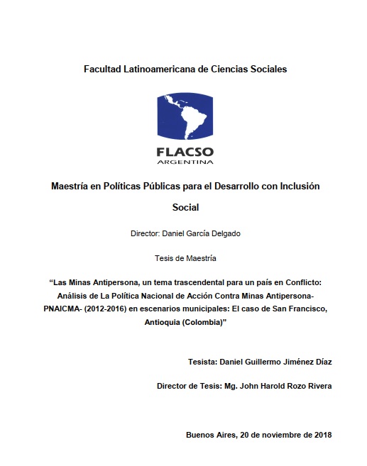 Esta investigación, aborda el asunto de las minas antipersona desde la perspectiva de la política pública, visibilizándola como respuesta institucional ante un problema de orden nacional. Lo anterior, se presenta por medio de la caracterización y examinación del fenómeno de la Acción Integral Contra Minas Antipersonal (AICMA) en Colombia, por medio Implementación del programa denominado “Proyecto para el Fortalecimiento de la Acción Contra Minas (PF) (2012-2016)” por parte de la Dirección Descontamina Colombia (DAICMA) en el municipio de San Francisco- Antioquia, en el marco de la PNAICMA.