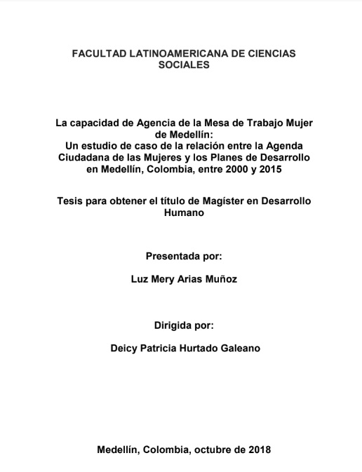 La presente tesis tiene como objetivo el análisis de la capacidad de agencia de la Mesa de Trabajo Mujer de Medellín (MTMM), mediante el contraste de sus agendas con los planes de desarrollo locales a fin de determinar la incidencia política para el desarrollo humano integral de las de las mujeres de Medellín. Para avanzar en este propósito, se procedió a la reconstrucción de la genealogía de las agendas ciudadanas de las mujeres y su relación con los planes de desarrollo municipales en el período 2000 – 2015, reconociendo en estos escenarios el campo de las oportunidades para la incidencia social y política de las mujeres de Medellín, así como los logros y limitaciones de su agencia en el desarrollo local.