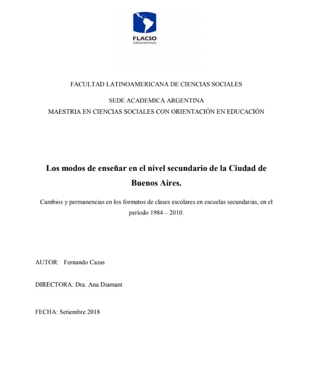 Para abordar estos interrogantes debieron tomarse algunas decisiones metodológicas. Esta tesis abarca el período 1984 – 2010 acotado a la Ciudad de Buenos Aires y a un conjunto de clases escolares. Para poder recuperar la información sobre lo que sucedía en esas clases escolares que ya forman parte de la historia reciente, se recurrió a dos fuentes principales: los testimonios de docentes y alumnos de esas clases y los documentos oficiales que abordaban la cuestión de los cambios en la enseñanza. La fuente testimonial permitió reconstruir registros de algunos modos de enseñar tal como se daban en el cotidiano de la vida escolar. A través de los relatos de sus protagonistas principales (docentes y estudiantes) pudo realizarse una recuperación de esa información que no se encontraba disponible en otras fuentes. Lo documental, permitió recoger información desde la perspectiva oficial sobre lo que sucedía con la enseñanza en las escuelas. La suma de ambas fuentes permite obtener un interesante panorama de los modos de enseñar en la escuela secundaria en la Ciudad de Buenos Aires en el período citado. Una tercera fuente han sido algunas investigaciones sobre la enseñanza en la escuela media que, a diferencia de la presente tesis, trabajaron con la observación de clases en ese período. Con esta fuente no solo se suman datos sino que además se trata de información obtenida desde otro planteo metodológico. Las conclusiones de este trabajo pretenden enriquecer el abordaje de los cambios y permanencias en los modos de enseñar en la escuela secundaria a partir del análisis de lo que sucede al interior de las clases escolares. La información recogida permite pensar algunas cuestiones con relación a la dinámica de esos cambios y a los contextos de implementación de las reformas educativas. Between 1984 and 2010, in Argentina, a series of educational reforms occurred that affected the educational system in general and the high school in particular. This one was very questioned by its authoritarian bias and its curricular outdatedness. The different reforms of that period, promoted changes with the explicit intention of democratizing and modernizing the high school. In this context, the main question of this thesis is to know what happened in the day to day of the school in what refers to the ways of teaching at the same time that the reforms were produced. Were there changes in teaching? Those changes were in line with those driven by the rules of reforms? What things did not change and remained? Were there changes that did not obey the logic of the rules of reforms? In summary, what changed and what did not in the ways of teaching? In order to retrieve information about what happened in those school classes that are already part of recent history, two main sources were used: the testimonies of teachers and students of those classes and the official documents that observes changes in teaching. The testimonial source allowed to reconstruct records of some ways of teaching as they occurred in the daily life of school life. Through the stories of its main protagonists (teachers and students) it was possible to recover this information that was not available in other sources. The documentary, allowed to collect information from the official perspective about what happened with teaching in schools. Considering both sources allows to obtain an interesting panorama of the ways of teaching in the high school in the City of Buenos Aires during the aforementioned period. A third source has been some research on teaching in high school that, unlike this thesis, worked with the observation of classes in that period. With this source not only data are added but also it is information obtained from another methodological approach.