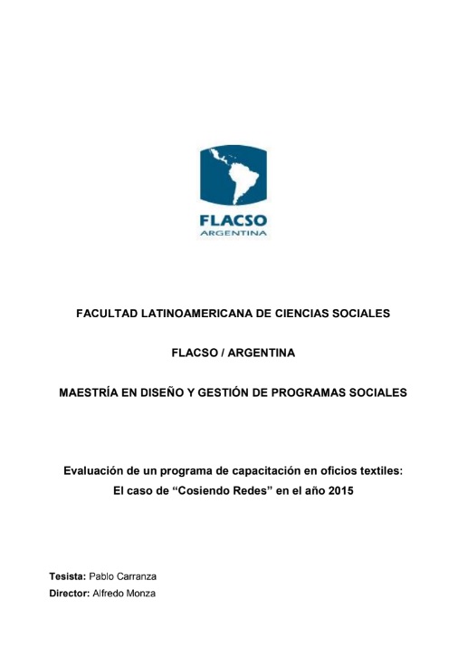 El siguiente trabajo busca analizar y evaluar el proceso de inserción laboral de un Programa de capacitación en oficios textiles implementado por una fundación articuladamente con el Ministerio de Desarrollo Social de la Nación. El mismo se desarrolló en una sede de dicho Ministerio en el barrio porteño de Cañitas en el que participaron y egresaron más de doscientos alumnos provenientes de la región AMBA. El Programa analizado, Cosiendo Redes, se viene desarrollando desde el año 2007 en Barracas, pero recién en el año 2014 se implementó en esta sede. Para ello, se describirá la implementación del Programa y las capacitaciones del ciclo lectivo 2015, especialmente lo relacionado a los procesos de vinculación laboral, sus resultados, limitaciones, objetivos y actores institucionales involucrados. El desarrollo del trabajo comienza con una breve descripción histórica del rubro textil en Argentina, luego se menciona el origen y características de la Fundación que ejecuta el Programa, Fundación Paz por la No Violencia Familiar, el Programa Cosiendo Redes y una referencia de los antecedentes del autor. A continuación, se presentan el planteo, los objetivos, el marco teórico elegido y una descripción de los recursos metodológicos utilizados para el desarrollo de la investigación. Luego, se describe el funcionamiento del área de inserción laboral y se realiza un exhaustivo análisis de la población participante a fin de conocer sus características e interpretar su comportamiento. Finalmente, se procesó la información obtenida en encuestas realizadas a una muestra de alumnos y a una selección del equipo técnico de Cosiendo Redes, con el objetivo de evaluar el Programa desde la visión de los distintos actores involucrados.
