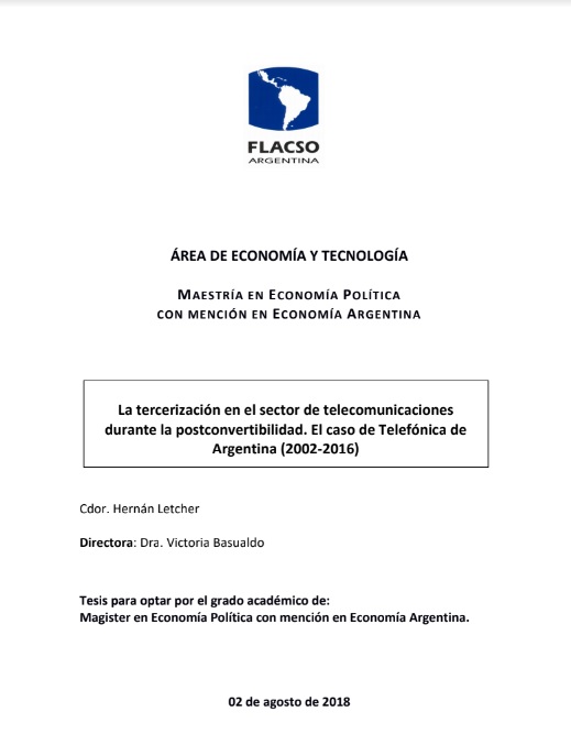 laboral en un sector de servicios particularmente influenciado por el avance tecnológico como es la telefonía argentina, y durante una etapa de crecimiento económico y del empleo como han sido los años posteriores a la crisis de 2001, denominados post-convertibilidad, debido a que se encuentran marcados, en su inicio, por la decisión en 2002 de poner fin a la política de convertibilidad que ató el peso argentino al dólar estadounidense. Para ello, se aborda el estudio del caso de la empresa Telefónica de Argentina para el período 2002-2016. El estudio se enmarca en una etapa que suscitó un fuerte debate sobre las continuidades y rupturas tanto en términos de la estructura económica como en relación con el mercado del trabajo. Subrayaremos aquí tanto las transformaciones en cuestiones centrales del mercado de trabajo como la creación de puestos de trabajo y el descenso de la tasa de desocupación, como la relativa continuidad de ciertos fenómenos preexistentes como el empleo no registrado, el trabajo eventual, la extranjerización y la tercerización. Es posible entender, además, a cada uno de estos fenómenos en el marco de una etapa de transformaciones geopolíticas regionales, de políticas estatales y también de decisiones empresariales que apuntalan la concentración y centralización del capital.