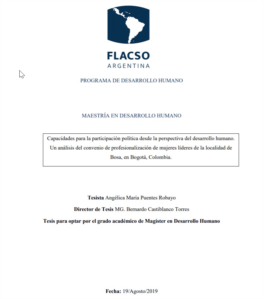 Esta investigación estudia el caso de un grupo de mujeres líderes sociales en la localidad de Bosa en Bogotá Colombia que fueron vinculadas a un proceso de profesionalización, con el ánimo de comprender si el proceso de profesionalización en el que participaron como lideres contribuye en el fortalecimiento de sus capacidades para la participación política desde una perspectiva de desarrollo humano. Desde la perspectiva de análisis cualitativo, a través de un diseño narrativo de tópicos y valiéndose de instrumentos como entrevistas y un grupos focales, fueron analizadas y codificadas sus, mediante el uso de Atlas.Ti, para la construcción de categorías emergentes sobre los ejes de indagación sexo género, profesionalización y género y ampliación de las capacidades para la participación política.