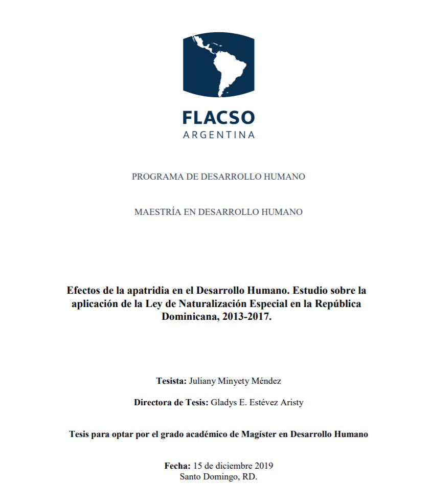 En los últimos años las autoridades de la República Dominicana han implementado una serie de medidas que iniciaron un proceso de desnacionalización en un amplio segmento de la población dominicana. Dicho proceso se consolidó con la Sentencia del Tribunal Constitucional (TC) No. 168 del año 2013, también conocida como el Caso Juliana Deguis Pierre. Mediante esta sentencia fueron anulados los certificados de nacimiento y cédulas de identidad a los hijos de migrantes en situación irregular nacidos en territorio dominicano entre el 16 de junio de 1929 y el 18 de abril de 2007, bajo el alegato de que fueron inscritos en el Registro Civil de manera irregular. Esta situación nos lleva a preguntarnos de qué manera este conjunto de eventos ha impactado el Desarrollo Humano de los afectados, aquellos quienes a pesar de la Ley 169-14 no han obtenido una respuesta razonable a su situación de apatridia. Otras interrogantes que surgen son: ¿Cuáles son aquellas dimensiones del Desarrollo Humano que se ven más afectadas por la problemática? ¿Es esta ley un instrumento garante de las condiciones básicas para propiciar un Desarrollo Humano Integral en los afectados? ¿Constituye esta normativa una restitución plena del derecho a la nacionalidad de los afectados? ¿En qué medida estos han podido retomar sus vidas y continuar ejerciendo sus derechos sociales, civiles y políticos? ¿Cuál ha sido el alcance en términos reales y absolutos de esta normativa?
