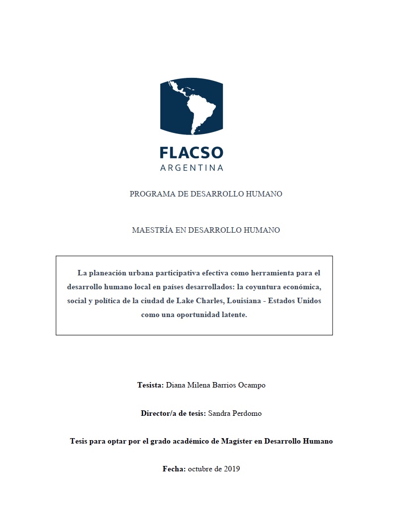 La planeación urbana participativa (PUP) efectiva supone una apertura de espacios deliberativos en la comunidad, a partir de los cuales los ciudadanos, no solo en el ejercicio de sus derechos, sino de su capacidad, se plantean una visión colectiva de ciudad y de esta forma contribuyen al desarrollo humano local (DHL). Por tanto, el objetivo de la presente investigación es indagar si ante el contexto económico, social y político que vive la ciudad de Lake Charles, se dan las condiciones político institucionales que eleven la calidad de la acción colectiva e impulsen la participación ciudadana efectiva para con ello contribuir a generar el Desarrollo Humano Local. Así las cosas, la presente investigación se divide en cuatro apartados: el primero presenta el problema de investigación; el segundo expone las consideraciones teóricas y metodológicas; el tercero devela los resultados de la información compilada y analizada; y por último, el cuarto desarrolla las conclusiones.