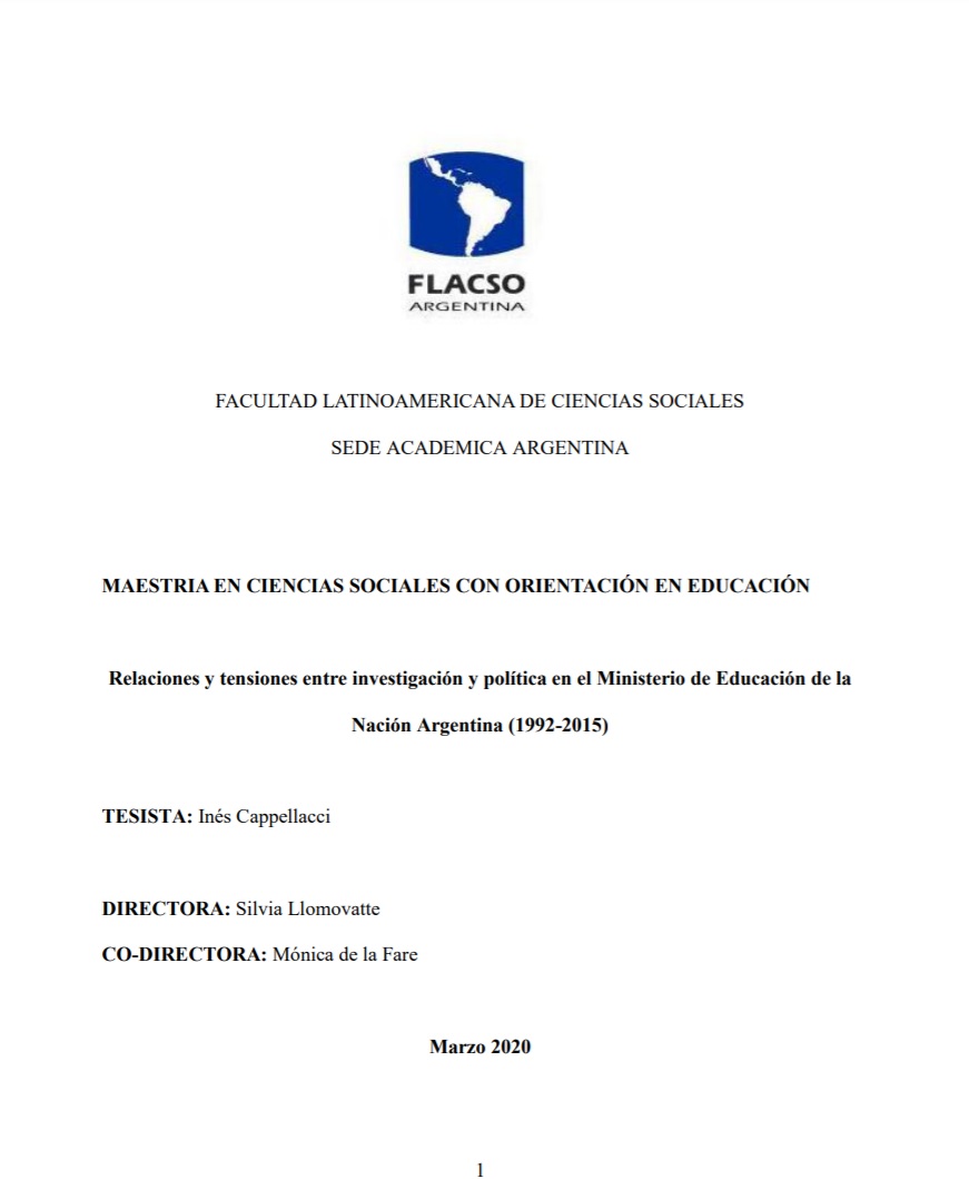 Esta tesis indaga las principales características y evolución del desarrollo de los diversos ámbitos específicos de producción de conocimiento a través de investigaciones educativas en el Ministerio de Educación de la Nación durante el período 1992 a 2015 y su relación con las políticas educativas, considerando una serie de interrogantes: ¿En qué espacios institucionales especializados se produjo conocimiento a través de investigaciones en el marco del Ministerio de Educación nacional? ¿Qué sentidos se les atribuía a lo largo del período 1992-2015 a los mismos? ¿Qué papel desempeñan las investigaciones en la definición de políticas educativas (inicio, desarrollo, evaluación, impacto)? ¿Cuáles fueron las herramientas o repertorio de acciones desplegadas para la producción de conocimiento a través de investigaciones? ¿Cuáles fueron las agendas de investigación desplegadas y de qué forma fueron articulándose con las políticas educativas en las sucesivas etapas analizadas? Es una tesis de corte cualitativo, que recoge los sentidos construidos por diversos actores y marcos normativos, considerando tres dimensiones de análisis: la normativa (cambios y continuidades de responsabilidades y acciones signadas), el repertorio de acciones (los lineamientos de trabajo) y la conformación de la agenda de investigación dando cuenta de la relación compleja entre investigación educativa y políticas educativas.