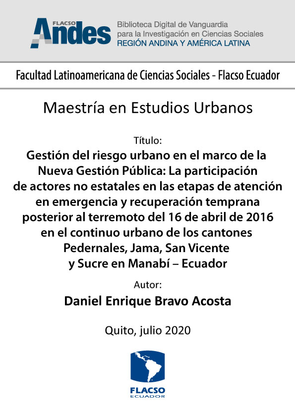 El crecimiento poblacional y la expansión de las áreas urbanas determinan que las ciudades sean espacios propensos a vulnerabilidad ante fenómenos naturales, que debe ser enfrentada a través de medidas de prevención antes, durante y después de los siniestros. El Ecuador por su posición geográfica, factores climáticos y configuración del suelo, está expuesto con mayor regularidad a eventos como precipitaciones prolongadas y de gran intensidad, sequías, terremotos, tsunamis y otros fenómenos que, combinados con las condiciones de infraestructura física y edificabilidad, establecen un escenario de vulnerabilidad.