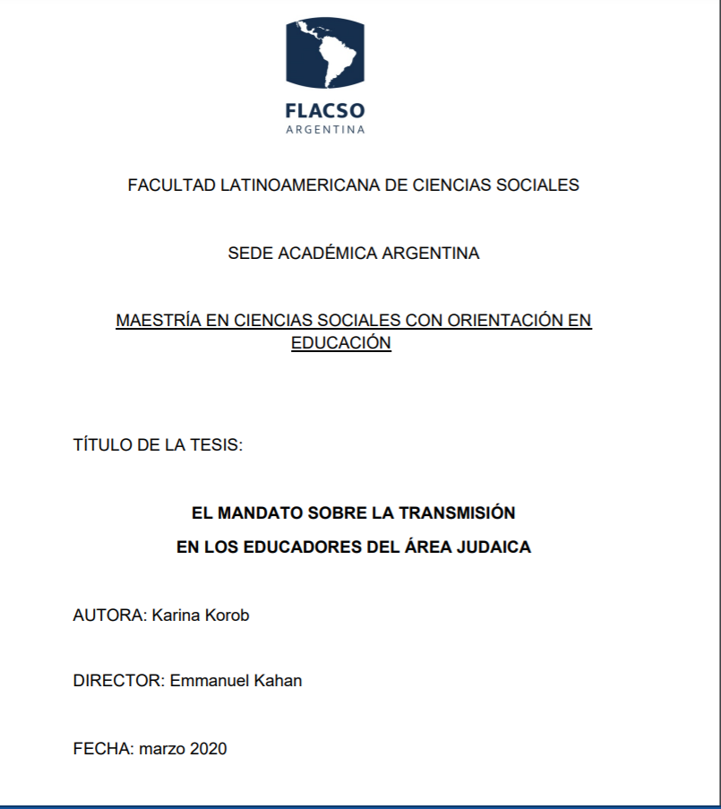 comprender qué es un maestro del área judaica, qué implica esta área de enseñanza, en dónde se desempeñan estos maestros, cuál es el vínculo entre transmisión y cultura judía, qué se considera mandato y cómo es vivido este subjetivamente por los educadores. Ambos procesos de investigación se complementaron para definir la categoría presentada, el mandato sobre la transmisión, lo que representa el aporte de esta tesis.