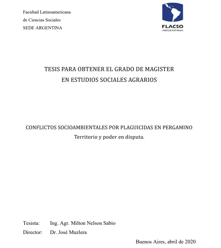 En el partido de Pergamino, las condiciones actuales de producción agrícola ocasionan la degradación ambiental y conflicto social, afectando la calidad de vida y la salud de las personas. Esto ha provocado la movilización de parte de la comunidad pergaminense. El paradigma productivo actual carece de una visión integrada y ante la falta de políticas públicas se rige por las leyes del mercado. La trasgresión a las ordenanzas municipales de no pulverización en las zonas de exclusión alrededor del casco urbano obligó la intervención judicial agravando el conflicto. Los aplicadores cuentan con las tecnologías necesarias para reducir las derivas y los riesgos a la salud de los vecinos. Sin embargo, crecen las denuncias y situaciones conflictivas. Subyace en el conflicto la discusión de fondo sobre el modelo productivo actual y futuro. La tesis analiza la percepción que los actores tienen sobre las causas del conflicto y las diferentes concepciones del rol del Estado. La investigación se apoya en un diseño metodológico de tipo cualitativo. La observación participante y las entrevistas semi-estructuradas develaron progresivamente un conflicto que excedía los aspectos tecnológicos en la utilización de los plaguicidas.