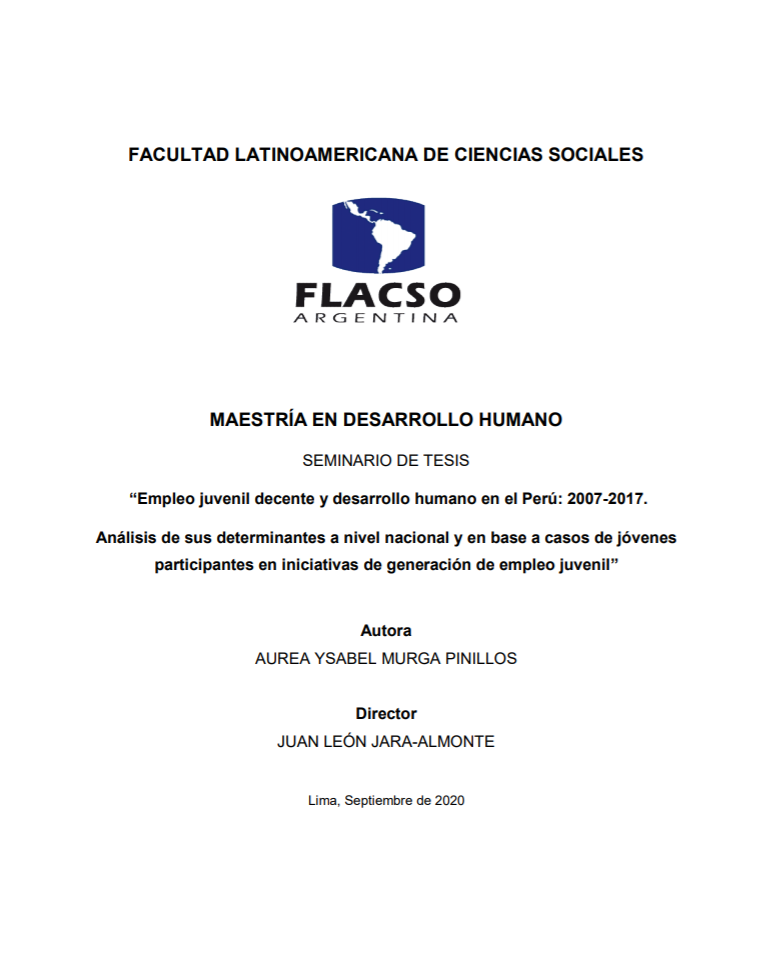 El objetivo de este estudio es identificar qué aspectos influyen en el acceso al trabajo decente de los jóvenes peruanos, así como los factores críticos de éxito de iniciativas que apoyan el proceso de inserción laboral de jóvenes en situación de pobreza y vulnerabilidad. Esta investigación es relevante, ya que contar con empleo decente es un aspecto fundamental para lograr el desarrollo humano, pero cerca del 80,3% de los trabajadores jóvenes en el Perú ni siquiera cuenta con las condiciones básicas de trabajo decente, consistentes en ganar más del salario mínimo y tener contrato de trabajo (Encuesta Nacional de Hogares-ENAHO 2017). Este estudio utiliza un método secuencial mixto, específicamente un diseño explicativo secuencial (Creswell, 2009: 211). En una primera fase cuantitativa de la investigación se identifican las variables asociadas al acceso al trabajo decente de los jóvenes a nivel nacional durante el período 2007-2017. En una segunda fase, cualitativa, se analizan entrevistas en profundidad aplicadas a 26 jóvenes trabajadores en situación de pobreza y vulnerabilidad, para conocer si algunas iniciativas desarrolladas entre 2007-2017 para generar empleo juvenil les ayudaron a mejorar su trayectoria laboral y a conseguir un trabajo decente. Finalmente, este estudio se enriqueció con los comentarios de siete expertos en la materia, cuyos aportes refuerzan los análisis y recomendaciones para la obtención de empleo decente.