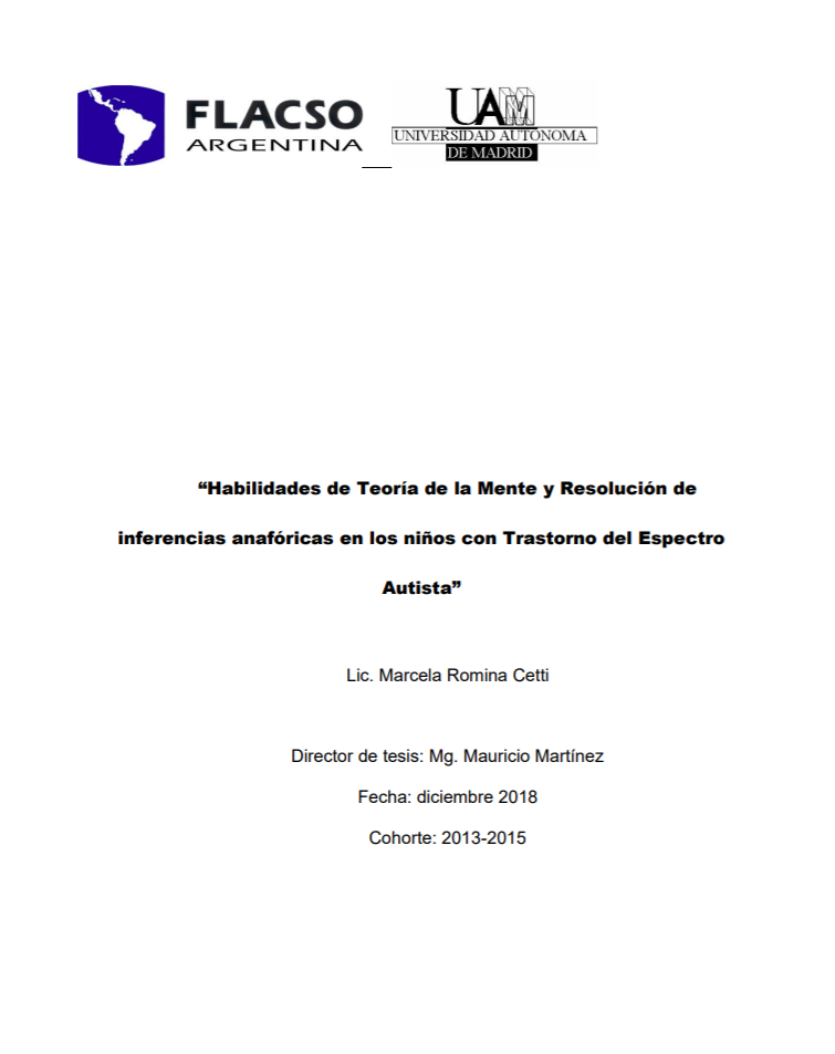 Nos hemos dedicado a niños con Trastorno del Espectro Autista (en adelante, TEA), debido a la escasa investigación realizada en comprensión escrita, ya que la demanda por parte de aspectos prioritarios del desarrollo (lenguaje, comunicación verbal y no verbal, déficit social) en esta población, reclama mayor atención (O´Connor & Klein, 2004). Se conoce la complejidad de los procesos que implican la comprensión lectora, entre ellos y de fundamental importancia para alcanzarla, la realización de inferencias (León, 2003), sin las cuales no sería posible la construcción de una coherencia local (resolución de inferencias puente, antecedentes causales y anafóricas), ni global (García Madruga, 2006). Asimismo, se requiere por parte del lector contar con habilidades de atribución mental para otorgarle intención a las acciones de los personajes de una historia y así comprender las relaciones que se entrelazan entre ellos. Dado el conocimiento acerca del déficit que las personas con Trastorno del Espectro Autista presentan en la habilidad mentalista, conocida con el nombre de Teoría de la Mente (Baron Cohen, Leslie & Frith, 1985) y su relación con la comprensión de textos (Valdez, 2011), nos hemos interesado en continuar el estudio de la misma.