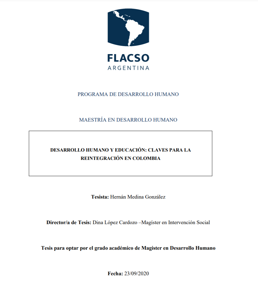 Por lo tanto, la presente investigación a manera de estado del arte, permite analizar la incidencia del proceso de educación para la reintegración en el fortalecimiento de las tres capacidades básicas del desarrollo humano; entendidas desde el acceso de las personas en proceso de reintegración a los ingresos necesarios para tener una vida digna, contar con una educación pertinente y de calidad, al igual que disfrutar de una vida saludable, con el fin de realizar recomendaciones a la Agencia Nacional para la Reincorporación y la Normalización -ARN- (entidad del estado colombiano que apoya esta tesis de grado) con el aval de la Facultad Latinoamericana de Ciencias Sociales – FLACSO Argentina, en el marco de la Maestría en Desarrollo Humano.