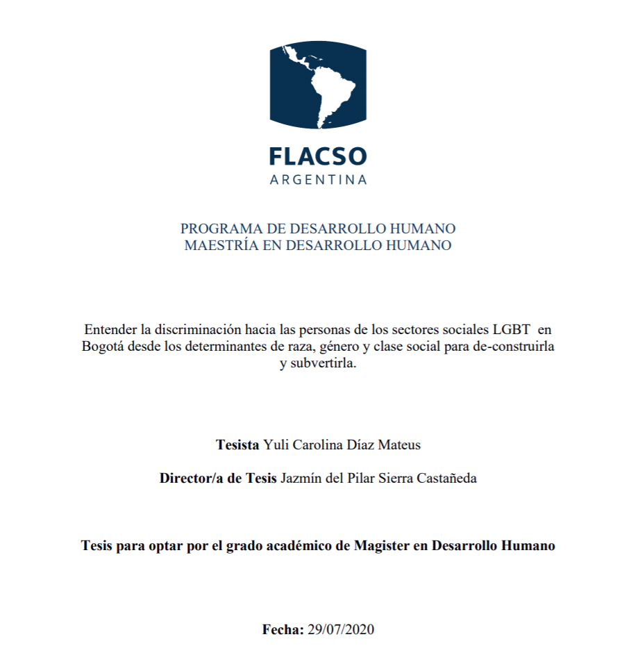 En un inicio la idea de hacer este trabajo de maestría nace de la oportunidad que tuve en mi ejercicio profesional de trabajar e impulsar procesos de participación y organización de las personas de los sectores LGBT en la localidad de Kennedy, conocer más de cerca las diversas realidades que viven las personas con orientaciones sexuales diversas en la ciudad de Bogotá, por lo tanto consideré importante retomar este proceso, recabar más información y profundizar. Estando segura de la importancia que el Estado debe impulsar políticas públicas en los territorios desde un enfoque de la interseccionalidad y no desde una mirada fragmentada, sino teniendo en cuenta el ser humano y su contexto. Estas experiencias causaron en mí, la fuerza de continuar ya que también tuve la posibilidad de conocer y trabajar con muchas personas de los territorios pertinentes a las comunidades diversas, por eso creo que valió el atrevimiento y el tesón de haber incursionado no sólo desde la teoría sino desde la heterosexualidad solidaria y acompañante. Así las cosas, el corpus en construcción se fue transformando gracias a la conducción profesional de tal manera que ahora es posible narrar en esta introducción como quedaron en definitiva los temas que acompañan y otorgan miradas profundas al tema de la discriminación a personas con sexualidades e identidades de género diversas. Este recorrido se hace en seis capítulos entrelazados con las determinantes de raza, género lo mismo que clase y desigualdades sociales como una triada que se vuelve rizomática o de raíces múltiples interconectadas envolviendo desenvolviendo al tema central de la discriminación.