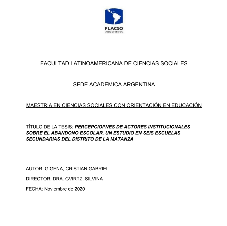 escuelas secundarias públicas de gestión estatal del Partido de La Matanza, a propósito de abordar el problema del abandono escolar en el nivel secundario. Teniendo en cuenta la extensión y dimensiones del Partido de La Matanza, se han seleccionado para la investigación dos escuelas de cada uno de los tres cordones en los que se encuentra dividido el Distrito. A su vez, mediante la técnica de entrevista, se ha trabajado sobre la respuesta del Director/a de la escuela, un integrante del Equipo de Orientación, un Profesor y un Preceptor. Este procedimiento se llevó a cabo en todas y cada una de las escuelas seleccionadas. Las escuelas consideradas han sido elegidas teniendo en cuenta cierto grado de representatividad de la población de escuelas, en cada uno de los cordones correspondientes, observando matrícula, ubicación y estructura de su Planta Orgánica Funcional (cantidad de secciones, turnos de funcionamiento, modalidades de bachillerato, etc.). Metodológicamente, el camino elegido ha sido el de obtener los datos de evolución de la matrícula, promoción, repitencia y abandono de cada escuela entre los años 2015 y 2018. En base a estos datos se han elaborado las entrevistas, analizados los relatos correspondientes contrastándolos con la teoría existente sobre el tema y finalmente se extrajeron algunas conclusiones que han permitido cierto grado de conceptualización referido a las percepciones. Es importante destacar que dentro de los aspectos metodológicos, un ordenador presente en todo momento de la investigación lo representa la idea de un trabajo no muy lejano a las