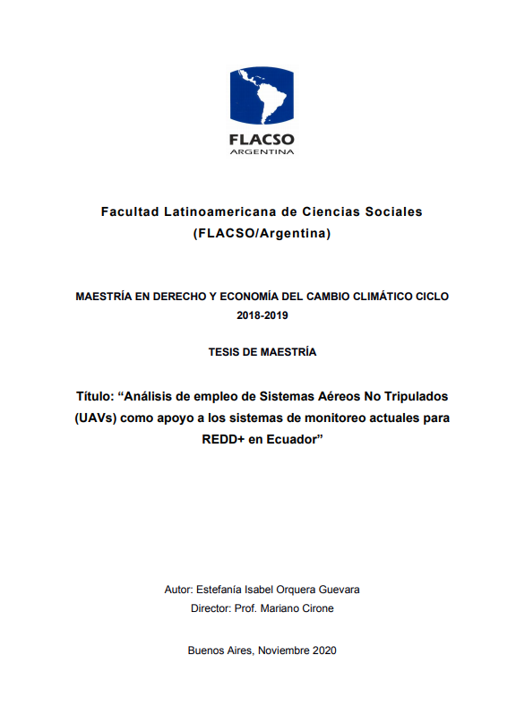 En este sentido, se analizó el uso de UAVs o drones como una herramienta complementaria a las empleadas en este proceso como satélites, monitoreo comunitario e in situ, entre otros. Para ello, en primer lugar, se evaluó la situación del Ecuador respecto a la protección forestal, analizando información estadística de deforestación, y el programa REDD+ actualmente ejecutado. Después, y basados en la información obtenida de fuentes oficiales como el Ministerio del Ambiente del Ecuador (MAE), se realizó una comparación entre diferentes sistemas de monitoreo utilizados y se describió con un ejemplo un sistema de apoyo de monitoreo que contemple el uso de UAVs.