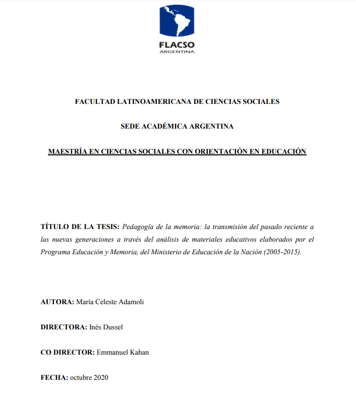 Pedagogía de la memoria : la transmisión del pasado reciente a las nuevas generaciones a través del análisis de materiales educativos elaborados por el Programa Educación y Memoria, del Ministerio de Educación de la Nación (2005-2015)